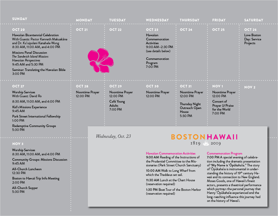 In 2019, Park Street Church welcomed a delegation from Hawaii. These representatives came from churches founded by missionaries who were sent out in 1819.